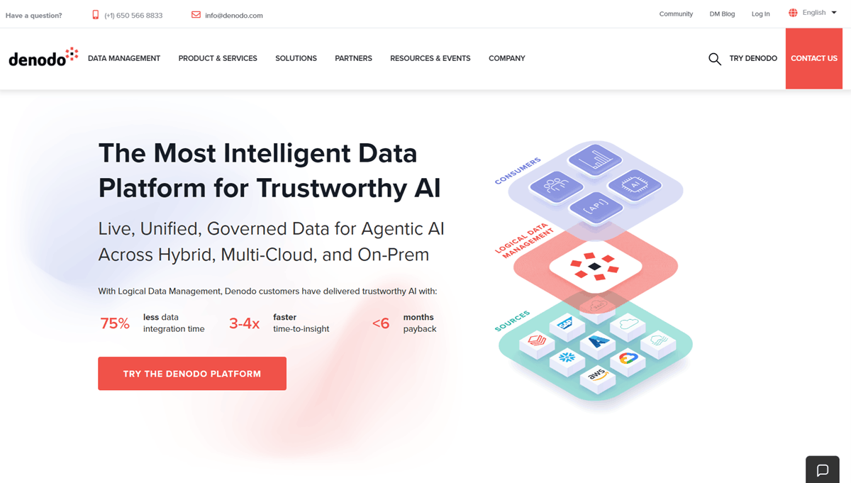 Denodo is the market leader in data virtualization and the standard choice for implementing logical data fabric architectures. Its core philosophy is to leave data where it lives while providing a unified, virtual access layer for consumers. It abstracts the complexity of underlying sources - whether cloud, on-prem, or legacy - allowing developers and analysts to query disparate systems using standard SQL. Denodo excels at high-performance federation, using advanced caching and query optimization to make distributed data feel like a single database.