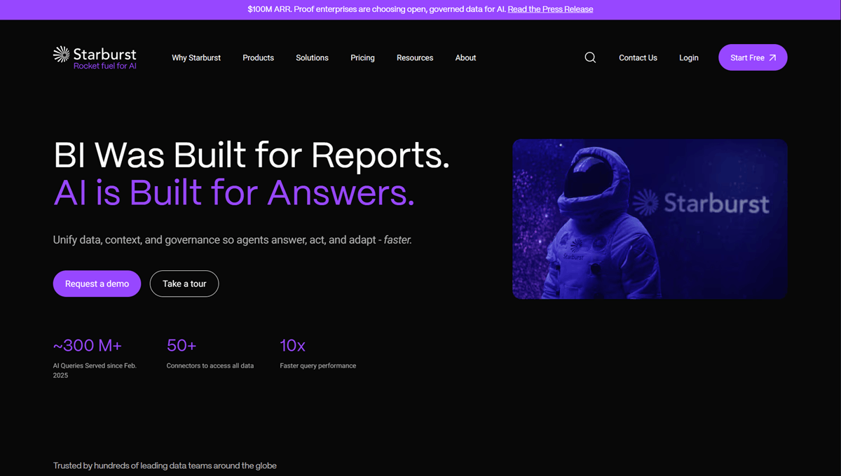 Starburst is a commercial distribution of Trino (formerly PrestoSQL) that powers high-performance, query-centric data fabrics. It is built for speed and scale, allowing organizations to run fast analytical queries across data lakes, warehouses, and operational databases simultaneously. Starburst treats the entire enterprise as a single SQL engine, making it a favorite for data platform teams who need to separate compute from storage. It is particularly strong in "Data Lakehouse" environments where teams want to query open formats (like Iceberg or Delta Lake) directly without ingestion.
