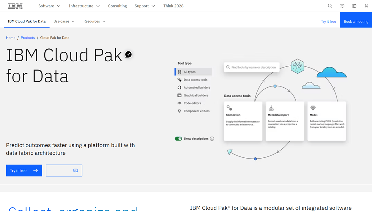 IBM Cloud Pak for Data is a modular, platform-centric data fabric solution designed for hybrid and multi-cloud environments. It integrates a wide array of data services - including virtualization, governance, lineage, and AI - into a coherent "fabric" architecture. IBM emphasizes a "connect, don't collect" philosophy, leveraging data virtualization to reduce data movement. It is particularly strong for organizations already invested in the IBM ecosystem (Red Hat OpenShift, DB2, Watson) who need a secure, enterprise-grade layer to manage data across on-premises mainframes and public clouds.